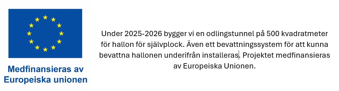 Under våren 2026 kommer en odlingstunnel på 500 kvadratmeter monteras på gården. I tunneln kommer hallon för självplock att finnas under sommaren. Att odal hallon i tunnel ger goda förutsättningar för hög kvalitet, jämn mognad och en längre skördesäsong.